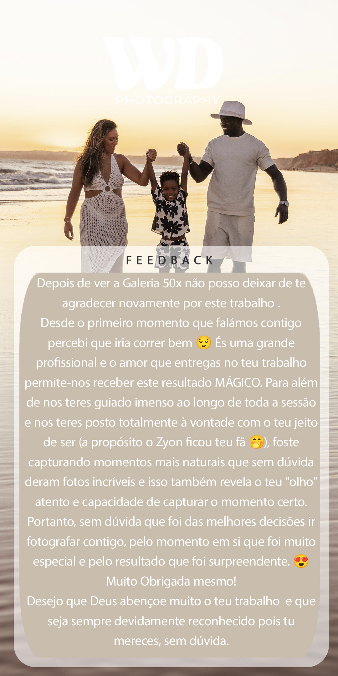 ”Ainda hoje mostramos a galeria a familiares e amigos e todos adoraram, obrigada por nos teres proporcionado um momento de partilha, sorrisos e sobretudo de capturares essas memórias que ficaram assim pra vida.